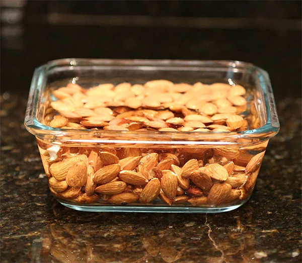Measure 2 cups of raw almonds and 2 cups of filtered water. Place into air tight container and let sit overnight, or for at least 12 hours.