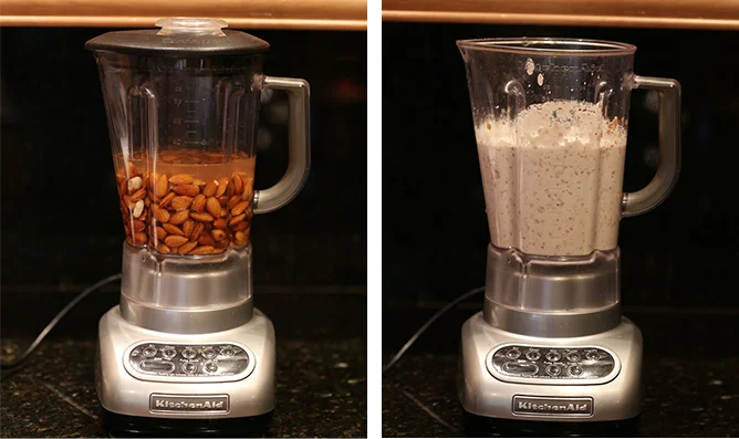 After their soak, pour the almond and water mixture into a colander and rinse the almonds well with fresh water.