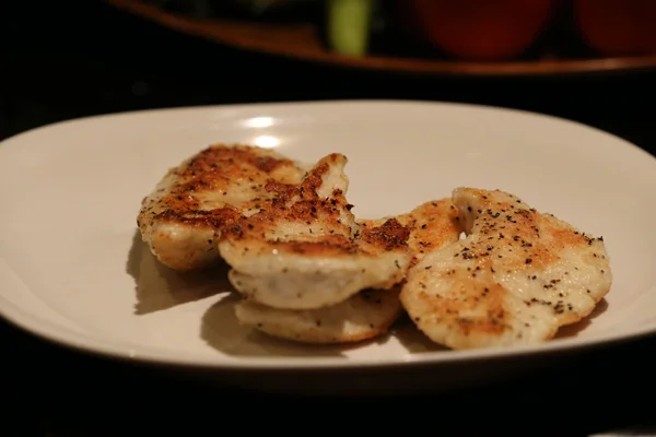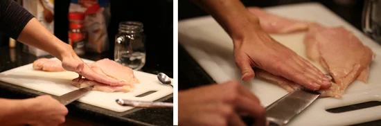 While waiting for the ghee to get hot, prep the chicken! Start by filleting the chicken so you have nice thin pieces. I do this by placing my left hand on top of the chicken, placing the tip of my knife in the center of the chicken and then push through to the other side. From there, slowly move the knife away from your center cut out to the edge of the chicken. Then turn your knife around and place back at your center cut, again moving the knife away from the center and towards the edge. Man, that was hard to explain! How about a few pics?