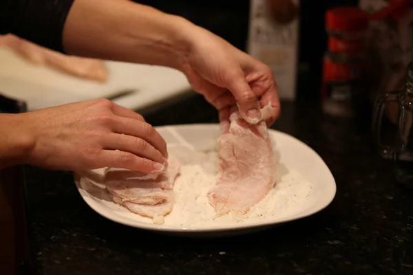 On a plate, mix the rice flour, salt, pepper and garlic powder. If you don’t want to use rice flour, you can certainly skip this step. It just helps get a good crisp on the chicken, as well as help thicken the sauce. If you do skip the flour, simply season the chicken with the spices once the chicken pieces are in the skillet. Take your chicken pieces and individually coat them in the flour and spice mixture.