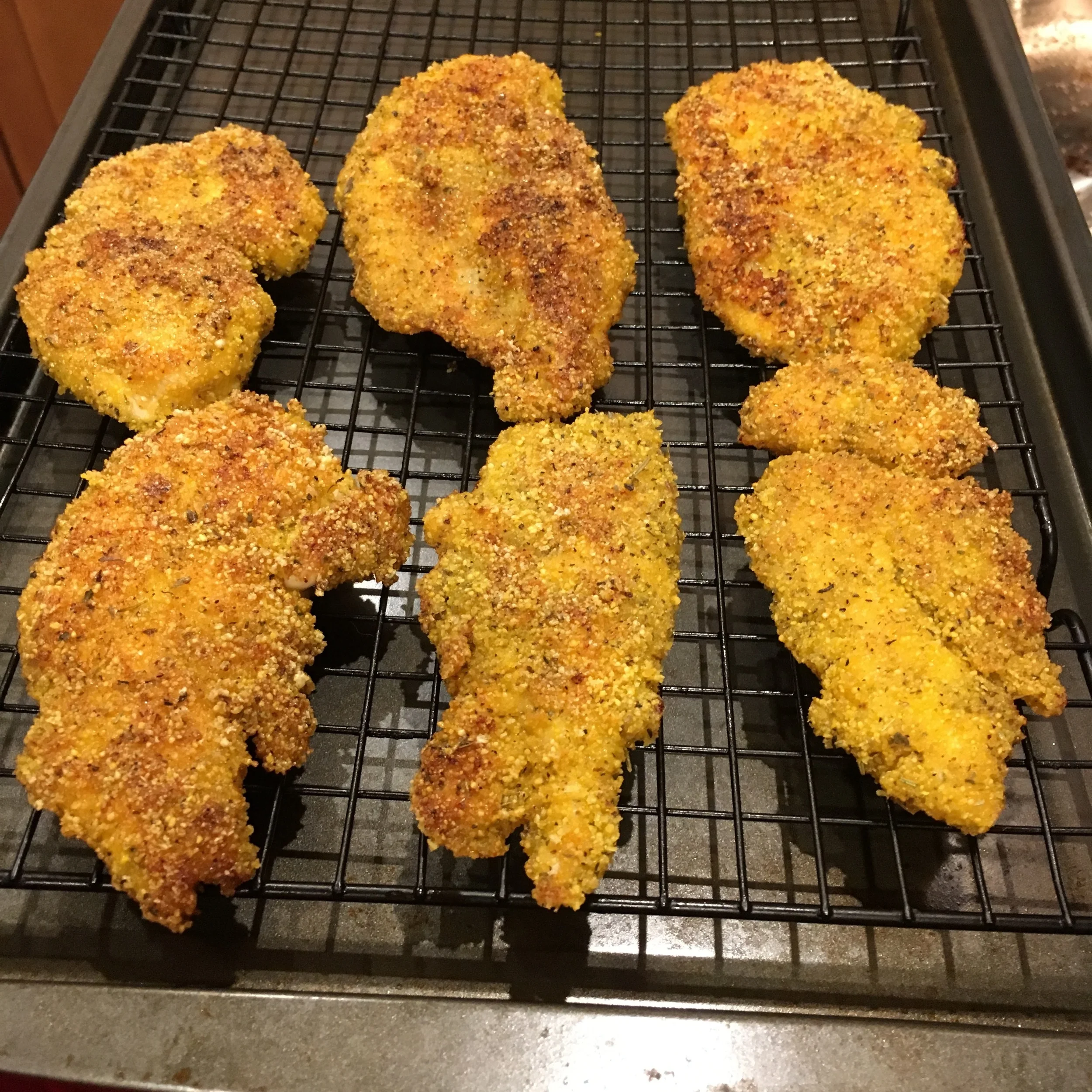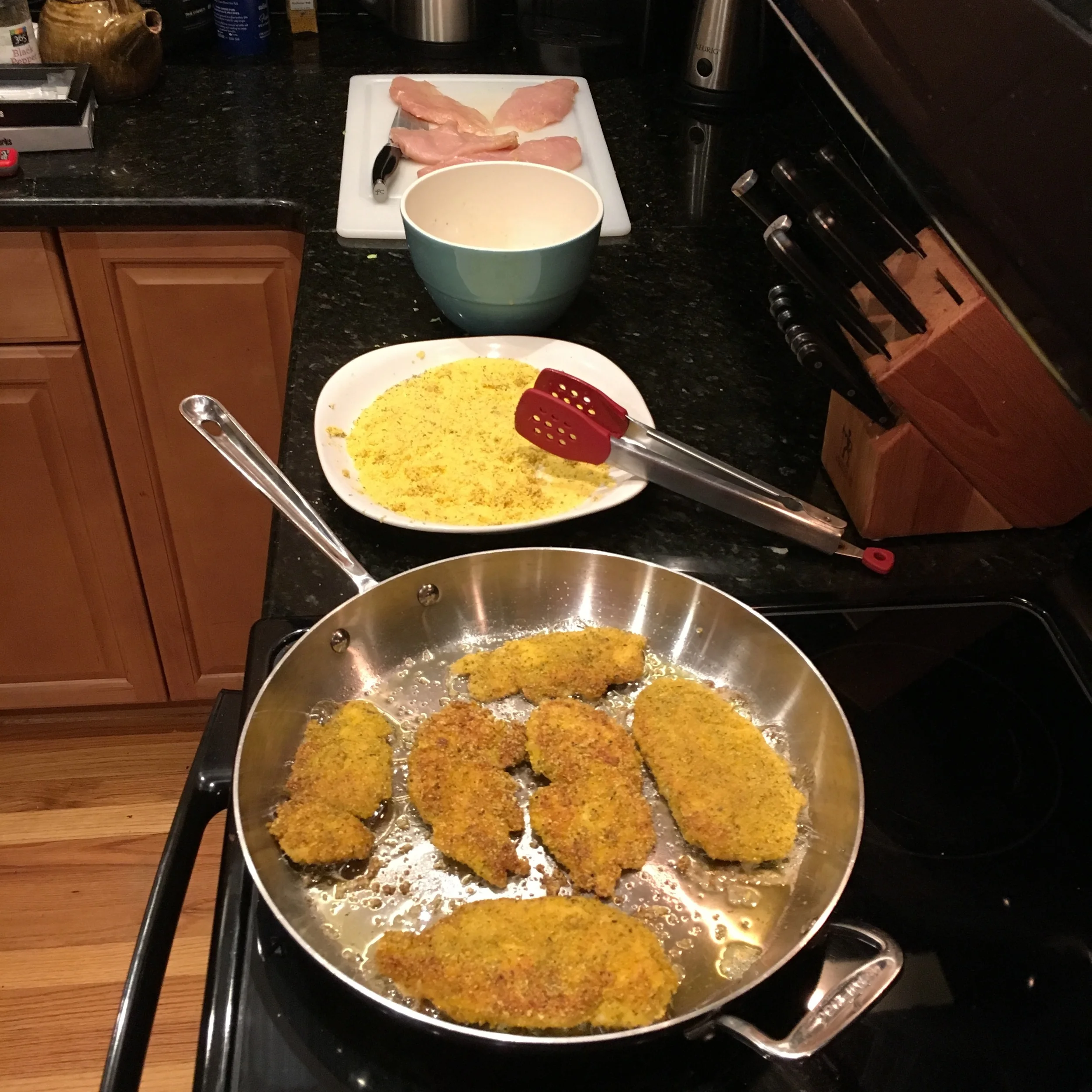 Let me tell you about one of my most favorite things to make, these delicious chicken cutlets. My mom used to make us breaded chicken cutlets which we would have with fettuccini alfredo and man, was that a good meal. Since going gluten free, I've tried several approaches to breading to try to get the right crispness on the chicken; almond meal, gluten free store bought breadcrumbs, etc. None of them really do the trick, plus, the gluten free store bought crumbs have a lot of crap in them that I would rather avoid. One day I used Glutino's breadcrumbs, which turns out to be just cornmeal and sugar. Why they felt the need to add sugar to cornmeal for breadcrumbs, I don't know. But I liked the final result so I hunted down some organic cornmeal from Amazon and voila! The perfect breading for my cutlets was found.